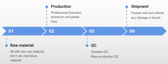 JE fokuserar alltid på produktkvalificering från aluminium och plast råmaterial till extruderingsproduktionslinje, från prover kvalitetskontroll till massproduktionskontroll, från ett starkt perfekt paket till hela hjärtatjänsten.